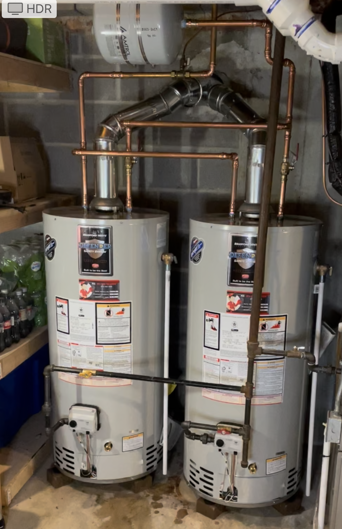 Two 50 gal water heaters April 30, 2023 1158 × 1791 Two 50 gal water heaters Two water heaters piped in a reverse return configuration. New flue liner installed.